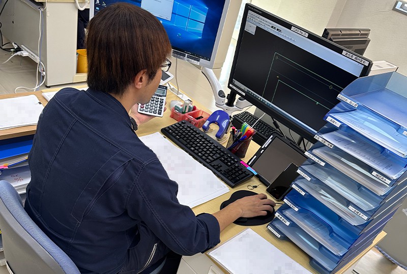 ブランク加工係では、まずお客様の図面を元にプログラムで平面展開図を作成します。この展開図に基づいて素材を切断したり穴をあけるのが「ブランク加工」です。当社ではブランク工程において、ターレットパンチプレス機、レーザー加工機、レーザーパンチ複合機の3台を使い分けます。金型で挟んで型抜きするターレットパンチプレス機では、鉄材や数の多い製品を加工します。レーザー光で切断するレーザー加工機は、主に4ミリ以上ある厚板やステンレスに用いられます。どちらの加工能力も兼ね備えたのがレーザパンチ複合機です。ここが最初の工程なので、お客様や会社に迷惑をかけることがないように確実に作って次の工程に回すことを意識しています。また、ブランク加工は若い人が入ってくることが多い職場です。基本的なことをしっかり身につけ、製品づくりに役立ててもらいたいと思いながら接しています。